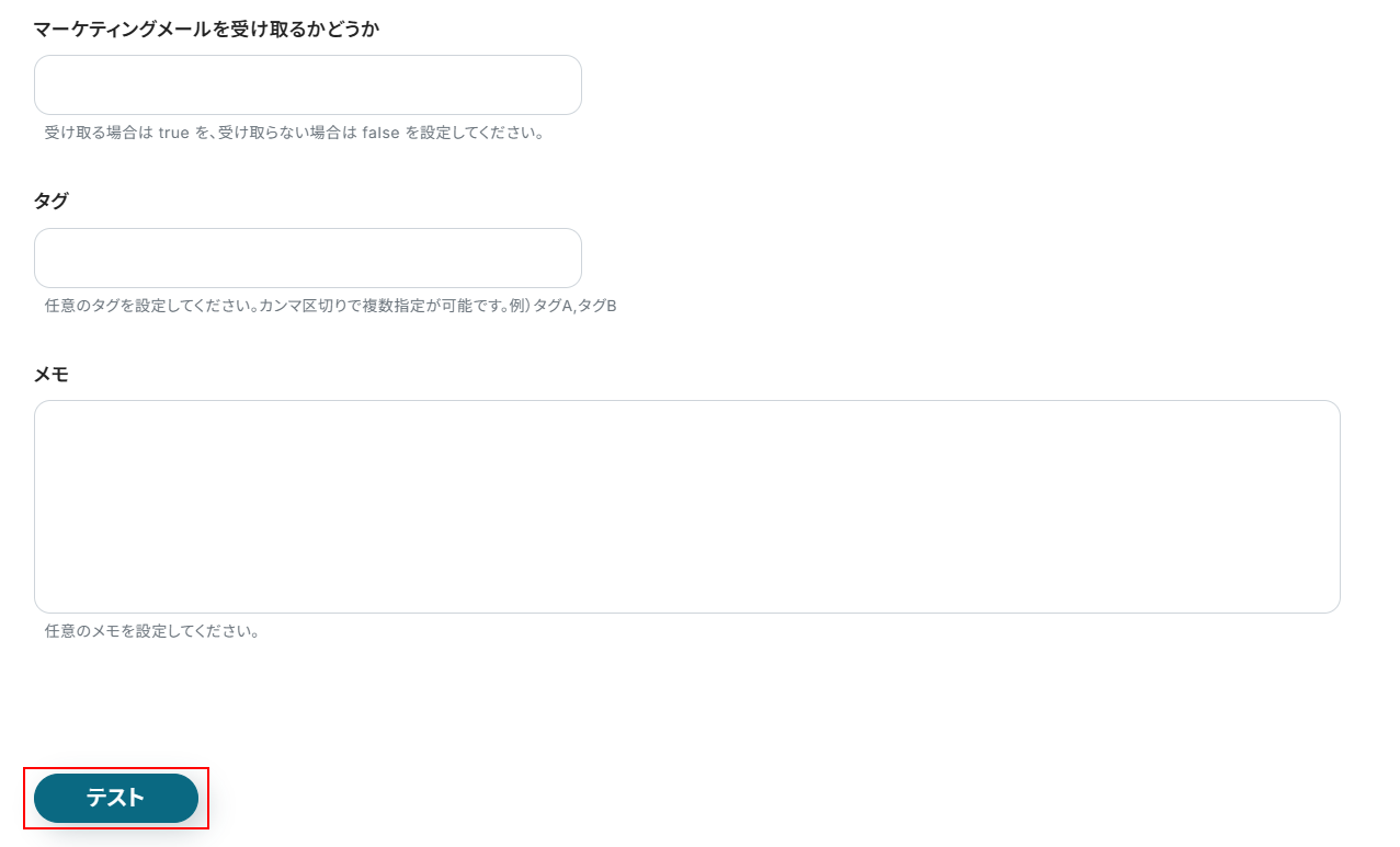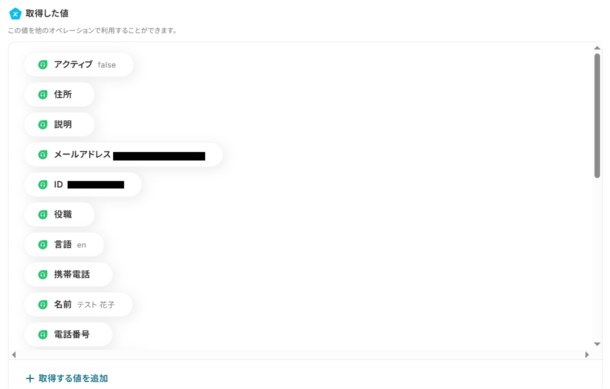 設定方法は、「コンタクトが作成または更新されたら」の項目でテストを行ったあと、「+取得する値を追加」から項目を追加することでメモ情報を取得した値として利用できます。