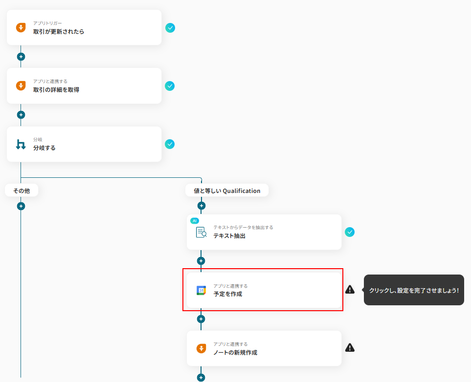 このテンプレートを使えば、特定の取引ステージに更新されたことをトリガーに、取引情報からテキストを抽出し、自動でGoogleカレンダーに商談やタスクの予定を作成できるため、スケジュール管理を効率化し、重要な営業機会を逃しません。