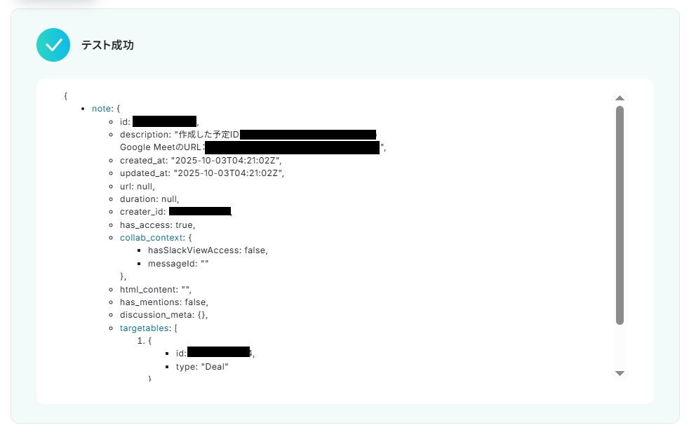 ・Freshsalesで更新する取引のメモ(Note)に「予定の開始日時」「予定の終了日時」「予定の説明」「取引先メールアドレス」を記載してください。