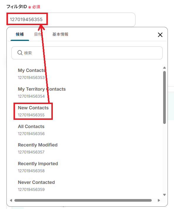 - フィルタID:入力欄をクリックすると候補が表示されるので、先ほど作成したコンタクトに応じたフィルタを選択してください。