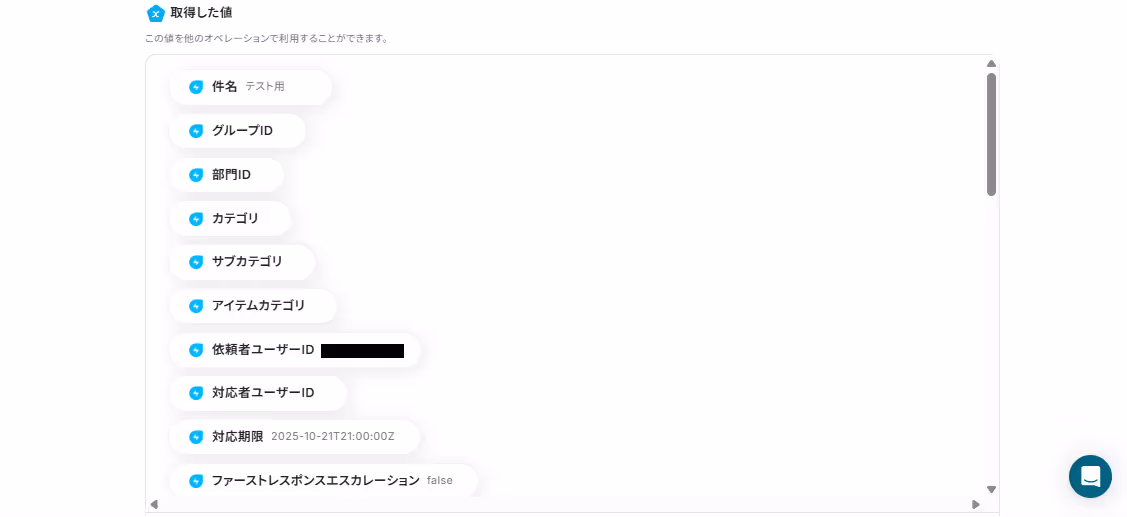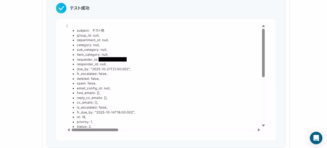 テストが成功すると、取得した値に、Freshserviceで作成したチケットのデータが表示されるます。