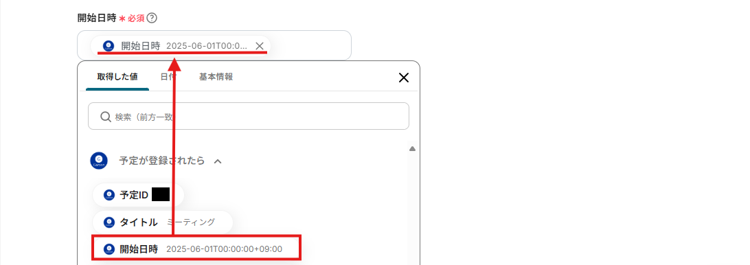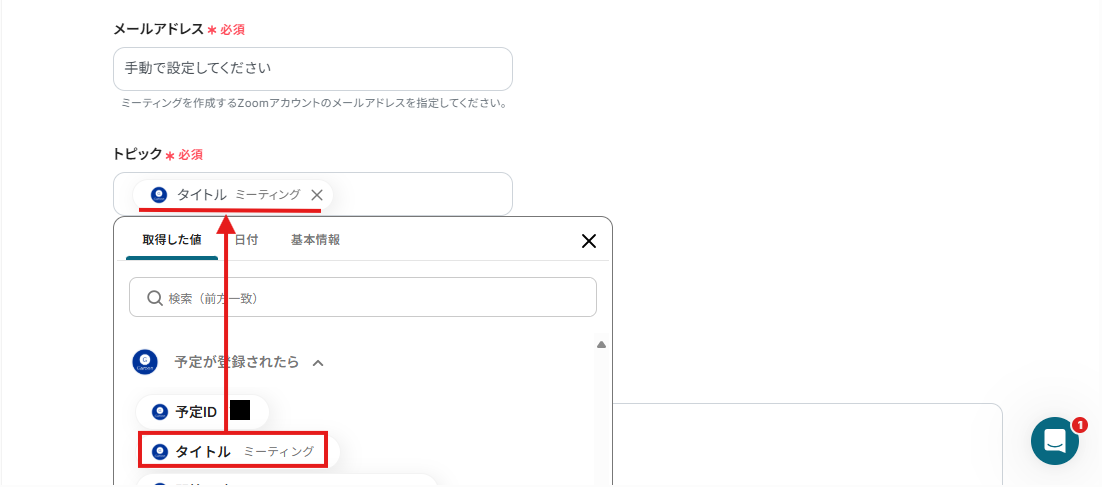 この設定により、Garoonに予定が登録されたら「タイトル」を取得し、自動でZoomのトピックに設定することができますよ!