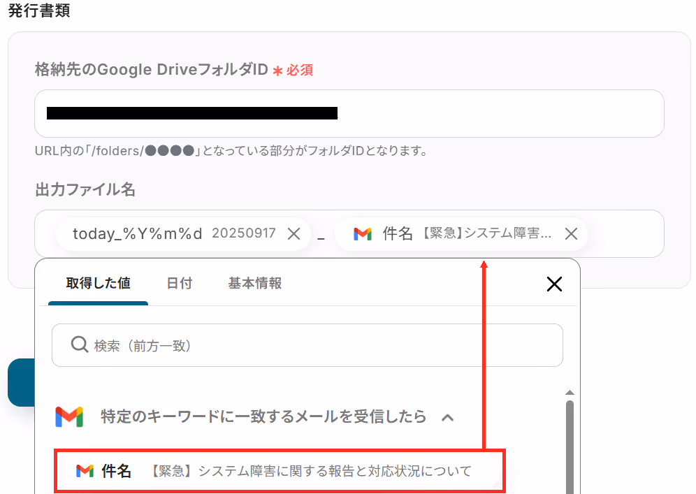 以下のようにGmail・Geminiから取得した取得した値を選択すると、メールの内容や要約結果を変数として反映させることができます。