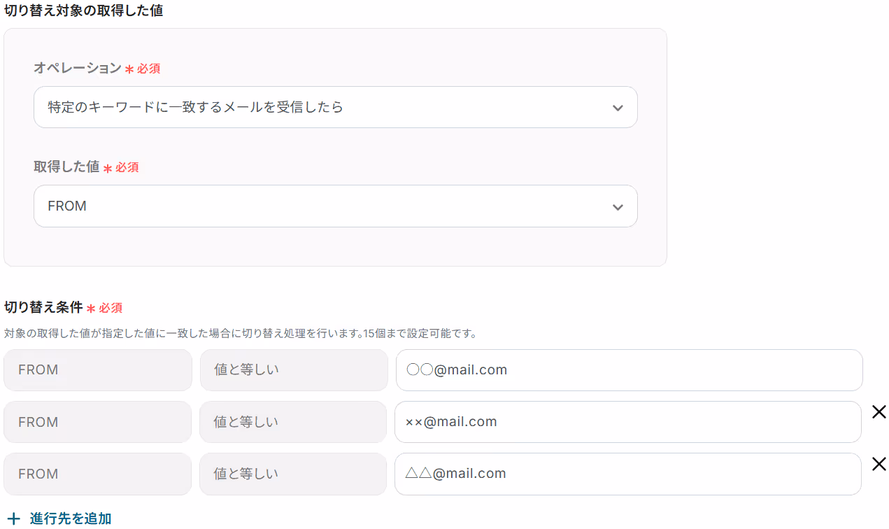 A:分岐や進行先の切り替え設定を追加することで可能です。「FROMが特定のメールアドレスと等しい場合」などと設定することで進行先の切り替えができます。あとはそれぞれの切り替え先で別の雛形やフォルダを指定してください。