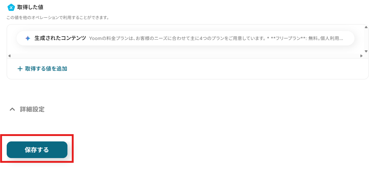 設定できたら「テスト」を行いましょう。 テストに成功すると「取得した値」に反映されます。 ここではGeminiの「生成されたコンテンツ」が作成されています。 「保存する」を選択しましょう。