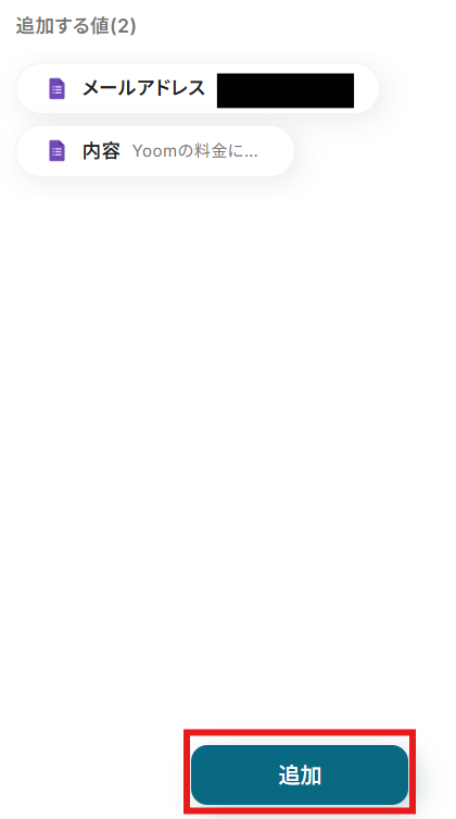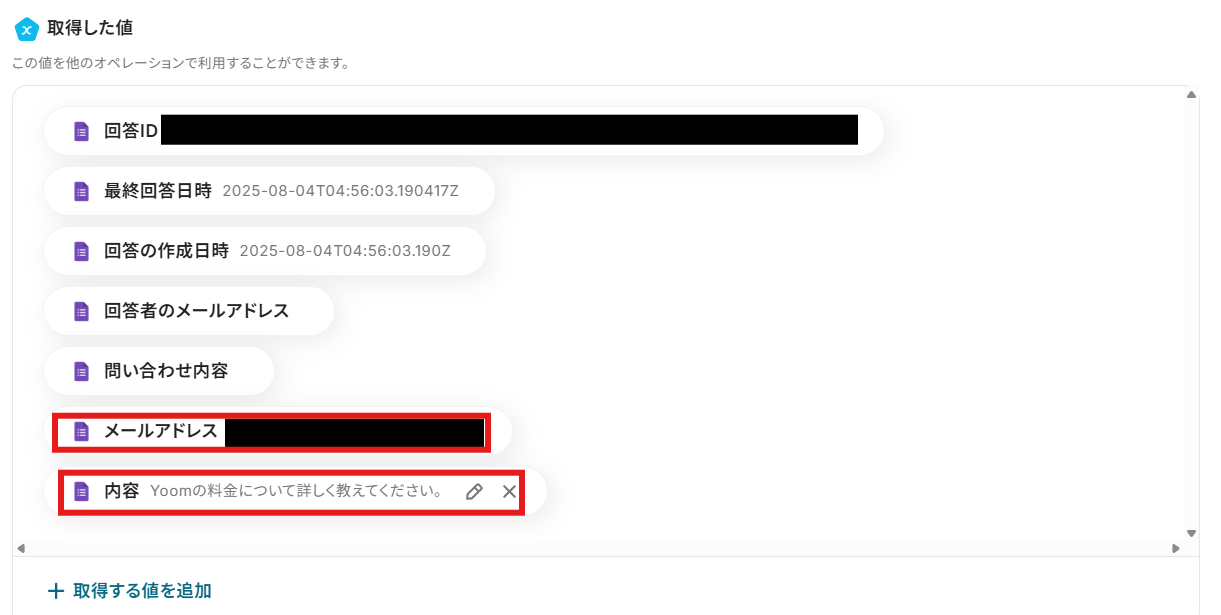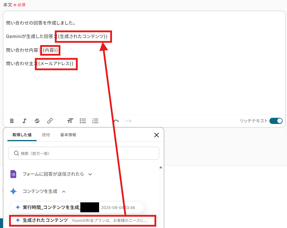 「本文」を設定しましょう。 例として「取得した値」の「生成されたコンテンツ」「内容」「メールアドレス」を使用しました!
