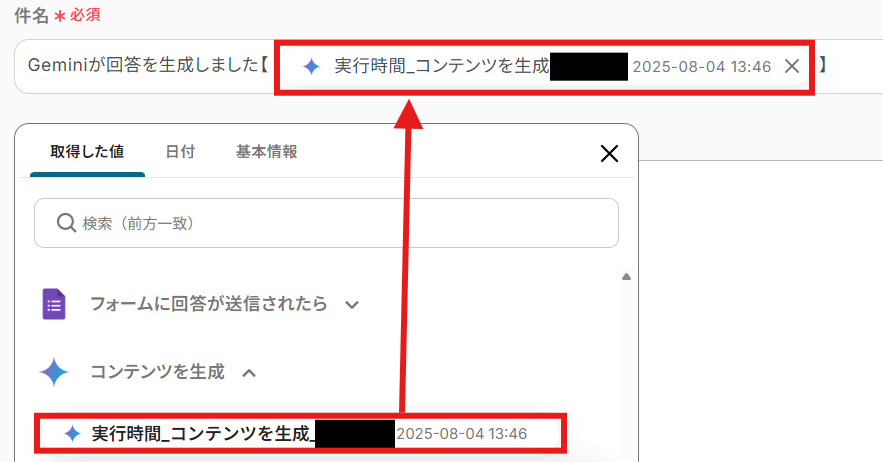 「件名」は「取得した値」の「実行時間_コンテンツを生成」を使って以下のように設定しました!