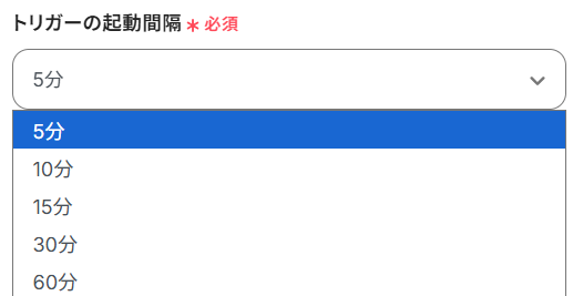トリガーの起動タイミングは、5分、10分、15分、30分、60分のいずれかで設定できます。 ご利用プラン によって、設定できるトリガーの最短間隔が違うので、その点は要チェックです。 なお、基本的にはそのプランの最短の起動間隔にしてお使いいただくことをおすすめします。