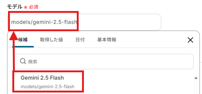 今回は例として2.5Flashが使用されているので、以下のように候補から設定しました!