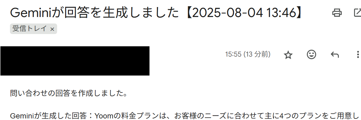 もし、Geminiが生成した内容を自動でGmailに連携し、メールの下書き作成や通知を行う仕組み があれば、こうした日々の細かな手間から解放され、より創造的で重要な業務に集中できる時間を確保できるだけでなく、対応漏れやコピペミスといったヒューマンエラーを防ぎ、業務の品質を向上させられそうです。