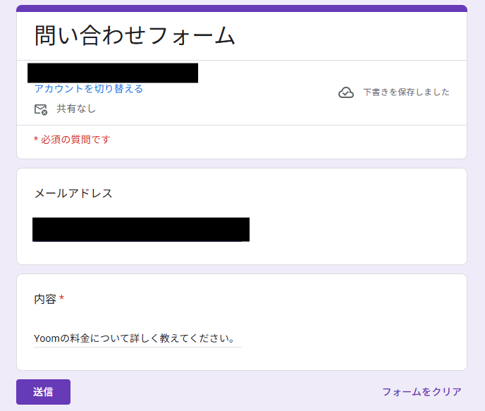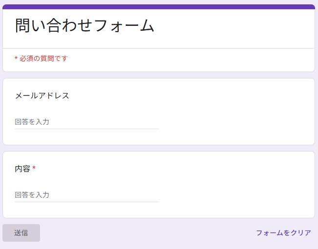 フォームの作成がまだの方はここで作成しておきましょう。 今回は例として以下のように作成しました。