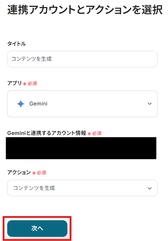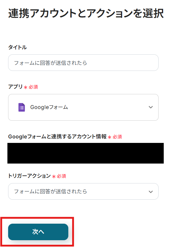 タイトルと連携するアカウント情報を確認し、アクションはテンプレート通りのまま「次へ」をクリックして進んでください。