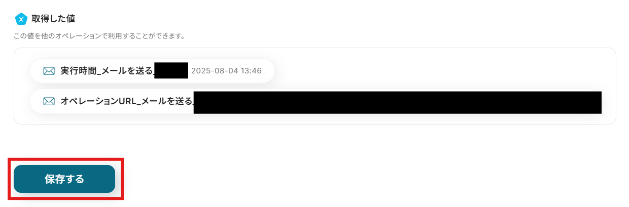 次に進んで、「メールの送信内容」を確認して「テスト」を行いましょう。 テストに成功すると「取得した値」に反映されます。 「保存する」を選択しましょう。