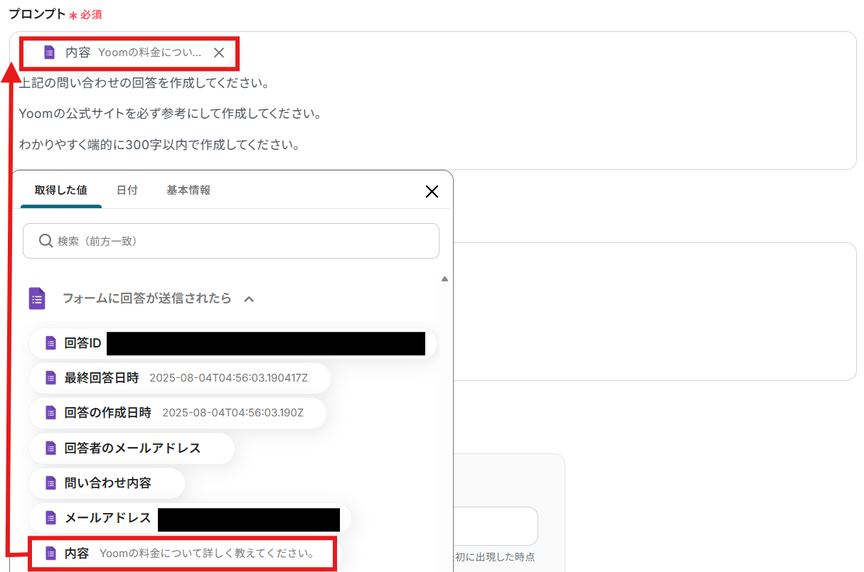 「プロンプト」を任意で設定しましょう。 今回は「取得した値」を用いて以下のように設定しました!