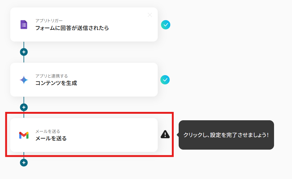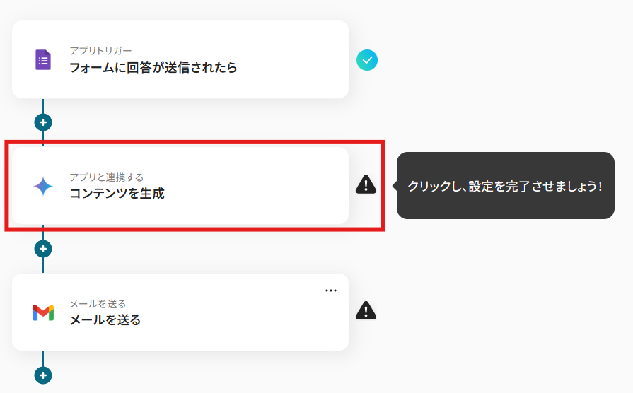 Googleフォームに寄せられた問い合わせ内容をトリガーとして、Geminiが最適な回答文を自動で生成し、その内容をGmailで担当者に通知するフローです。