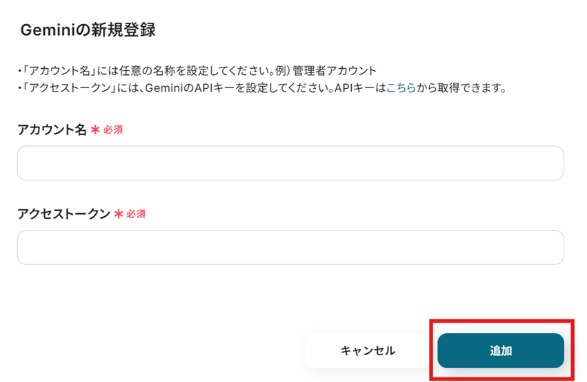 「アカウント名」と「アクセストークン」を入力して「追加」を選択しましょう。 APIキーはこちら から取得可能です!