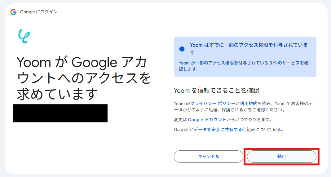アクセス権限について確認して「続行」を選択し、Googleフォームと同様にログインを進めてください。