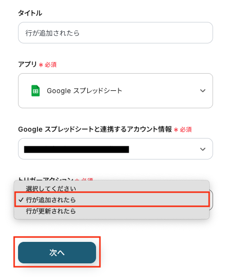 続いて、連携アカウントとアクションを選択に進みます。各項目の確認・入力をし、次に進みましょう!