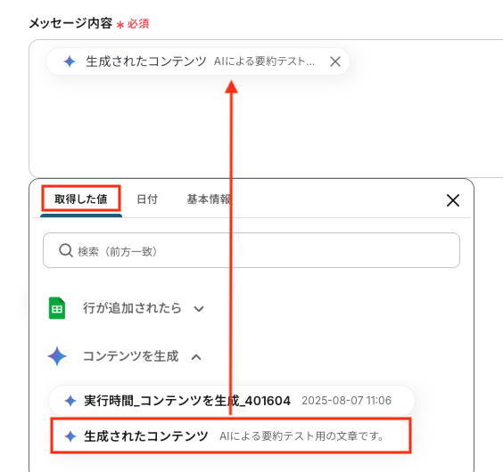「メッセージ内容」は、取得した値から選択してください。