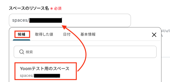 「スペースのリソース名」は、候補から選択します。