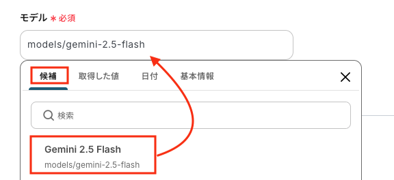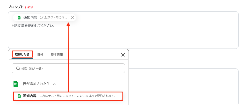 「プロンプト」は、取得した値から選択してください。