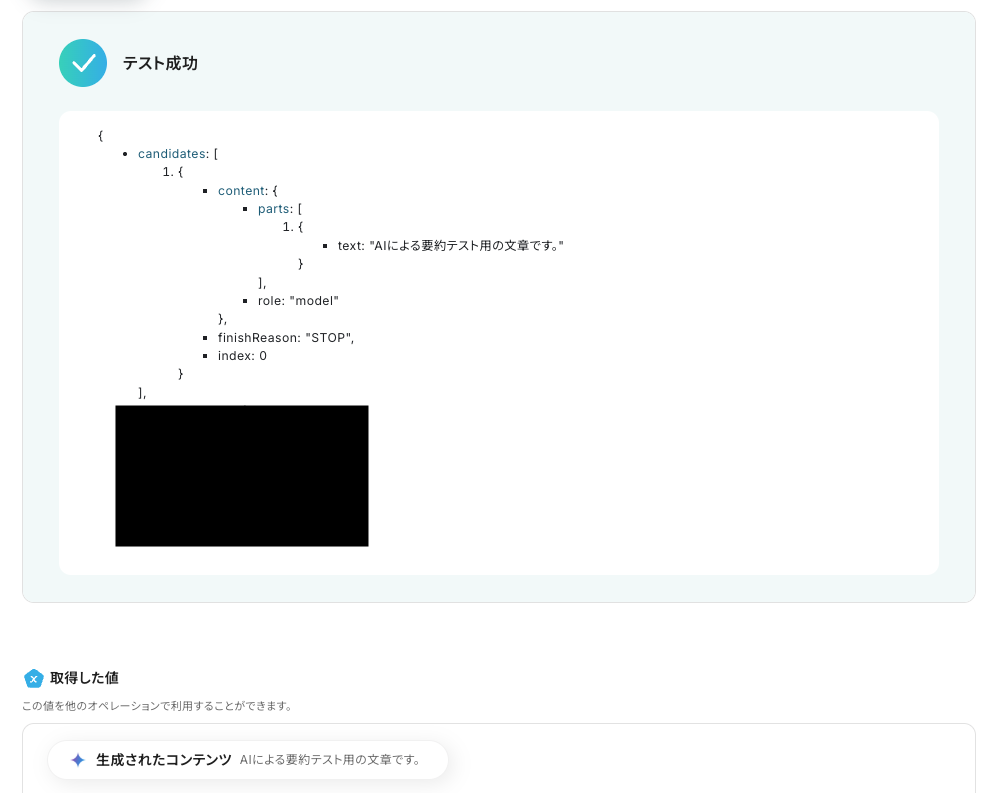 テストが成功すると、以下のように「取得した値」が表示されます。
