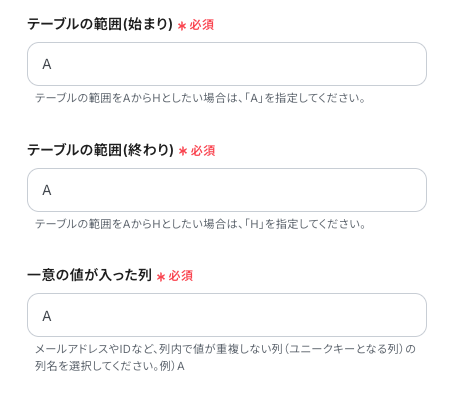 「テーブルの範囲」「一意の値が入った列」を入力するにあたり、ページ上部に記載のある注意事項を確認しましょう。