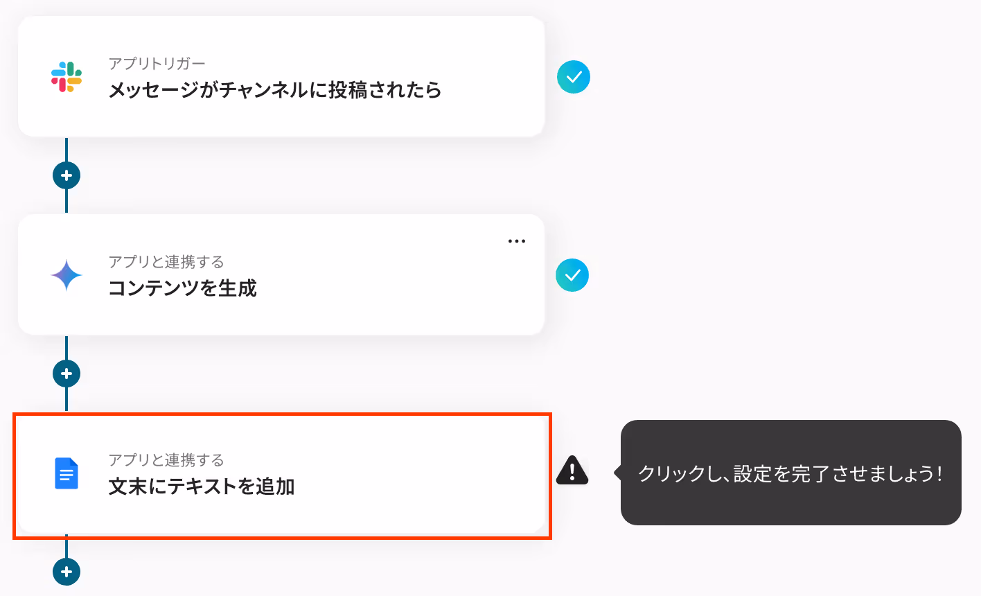 例えば、チャットで送信された内容をGeminiが自動で解析・要約し、その結果をGoogleドキュメントに追記するといった一連の流れを、人の手を介さずに実行することが可能です。