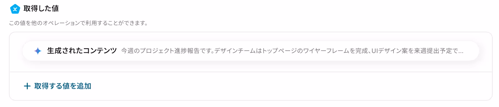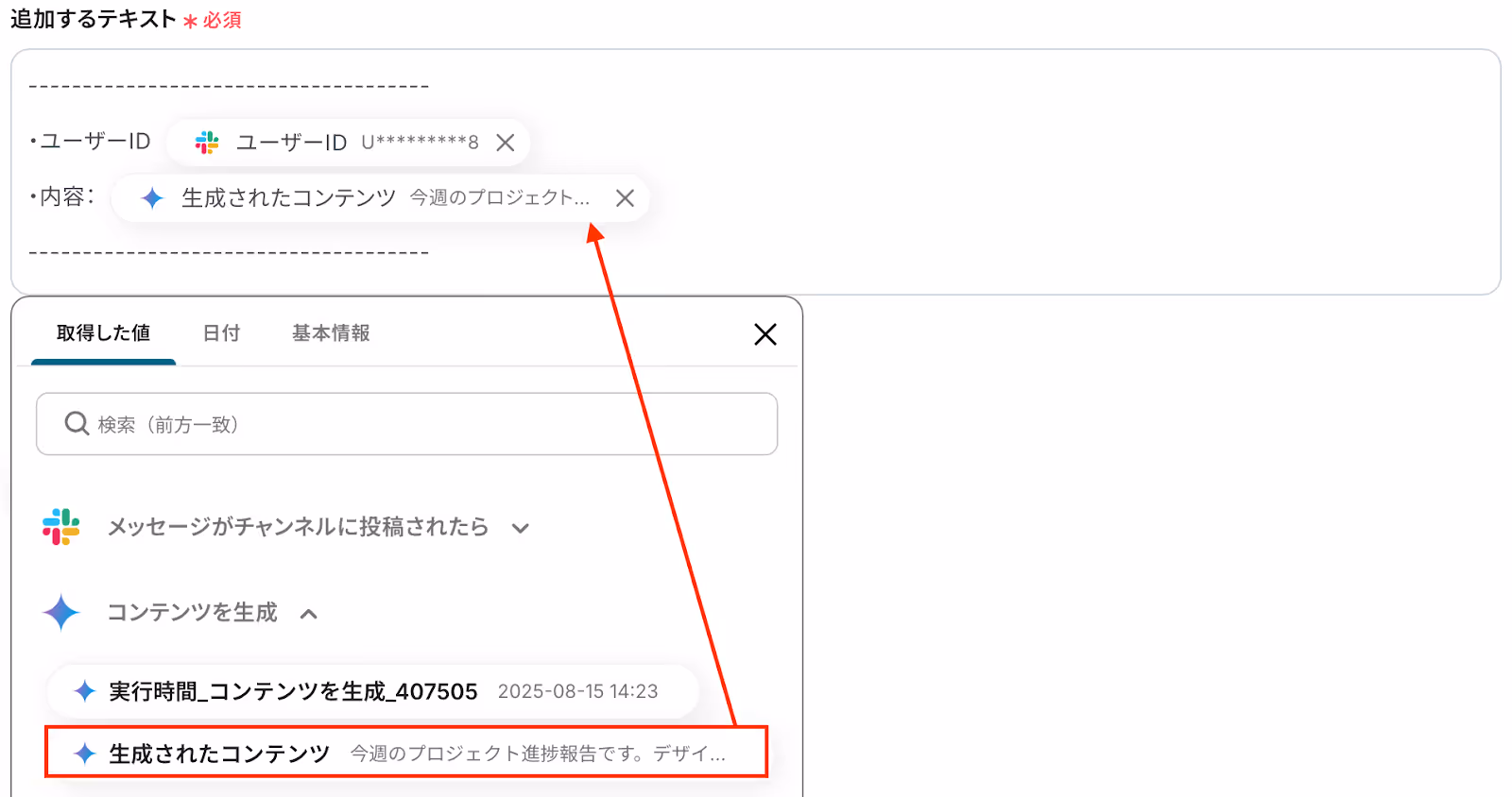 「下記内容を要約してください」という文言に加えて、前段階で取得した値を引用して設定してください。