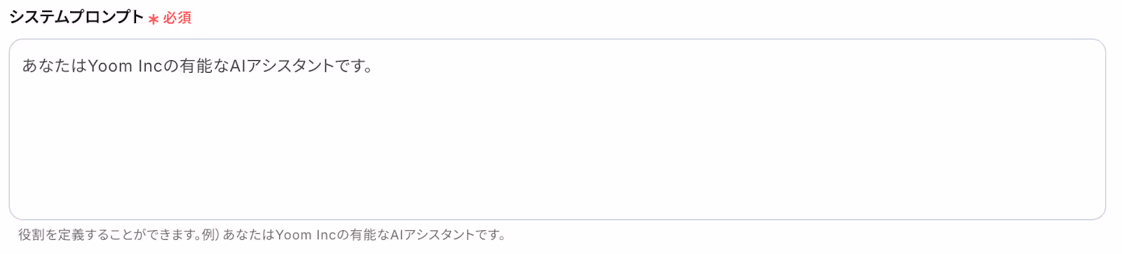 基本的には「あなたはYoom Incの有能なAIアシスタントです。」と設定しておきましょう。