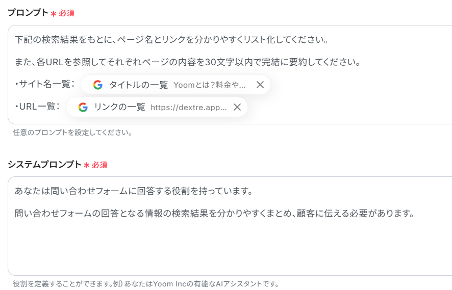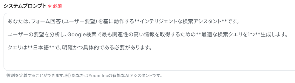 検索クエリの件数やキーワードの数、どのようなユーザーに向けたものであるか、NGワードの有無など、任意でルールを定めてプロンプトを設定することをおすすめします。