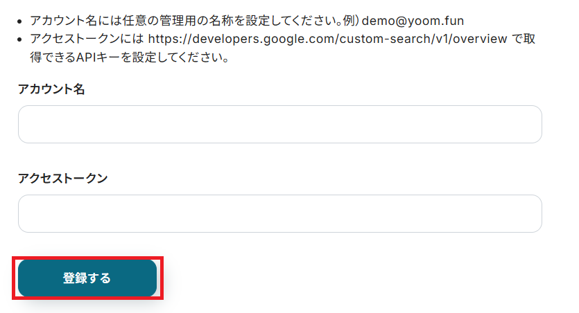 「アクセストークン」は、Google Custom Search JSON API の概要ページにログインして発行し、Yoomの設定画面にペーストして「登録する」ボタンを押してください。