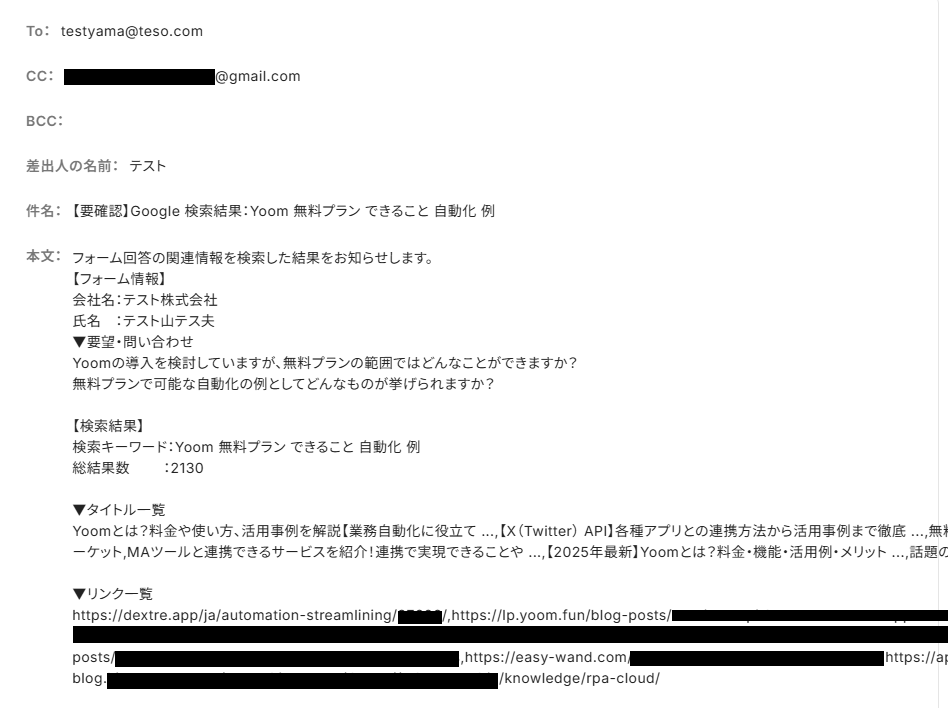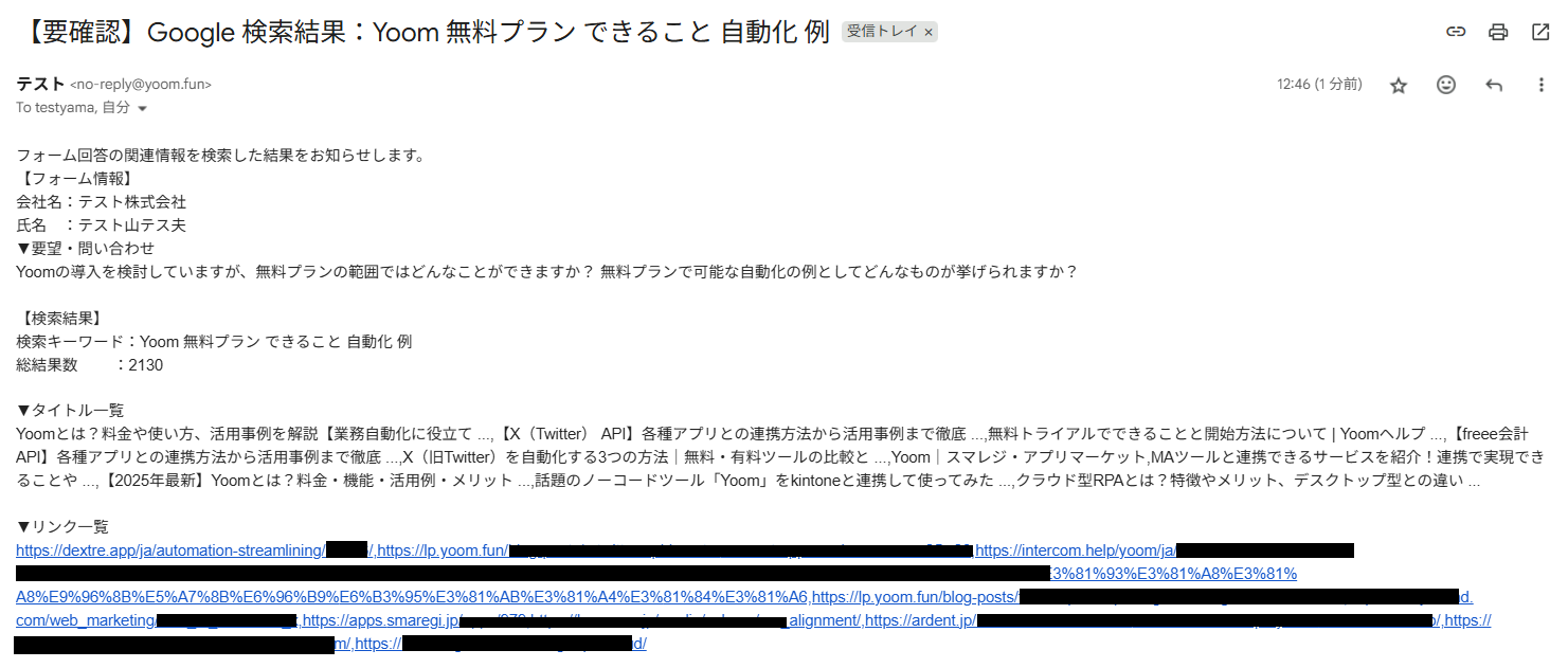 このワークフローを活用することで、フォームで送信された要望や問い合わせ、トピックをもとにGeminiが最適な検索クエリを自動生成し、Google 検索した結果をメールで通知することが可能です。