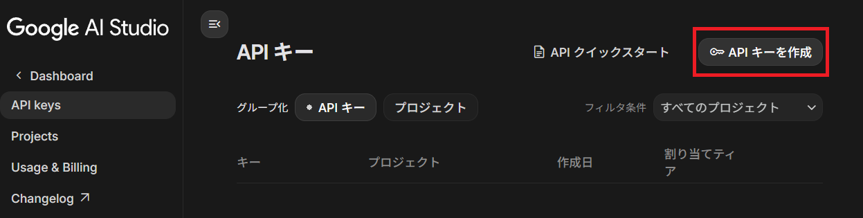ちなみにGeminiでのAPIキーの発行は、以下の画面から行えます。
