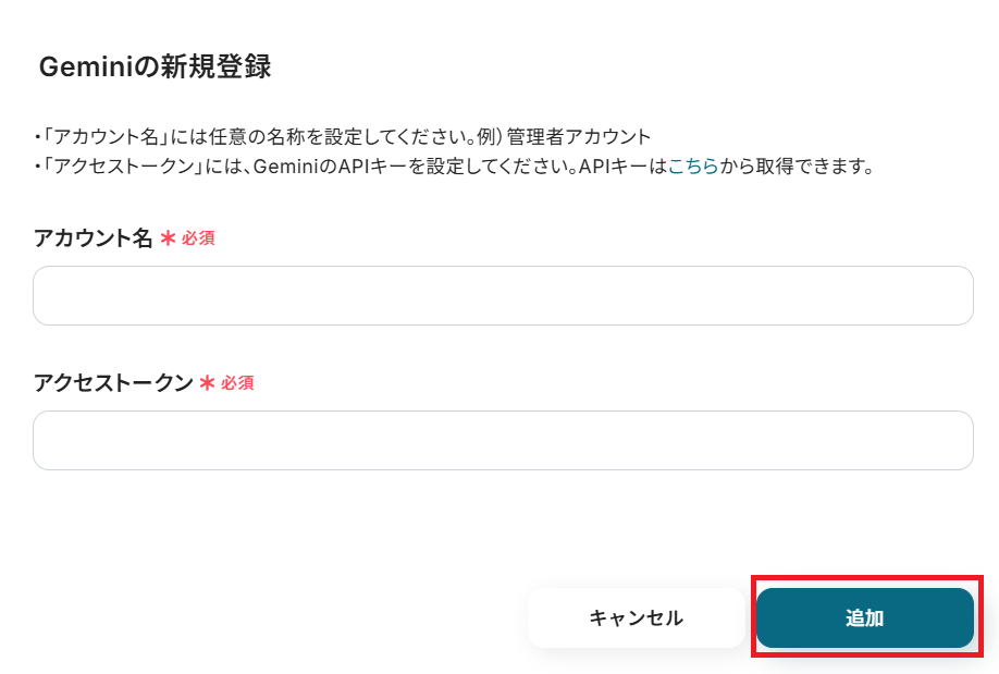 「APIキー」はこちらのページにログインした上で発行し、Yoomの設定画面にペーストして「追加」ボタンを押してください。