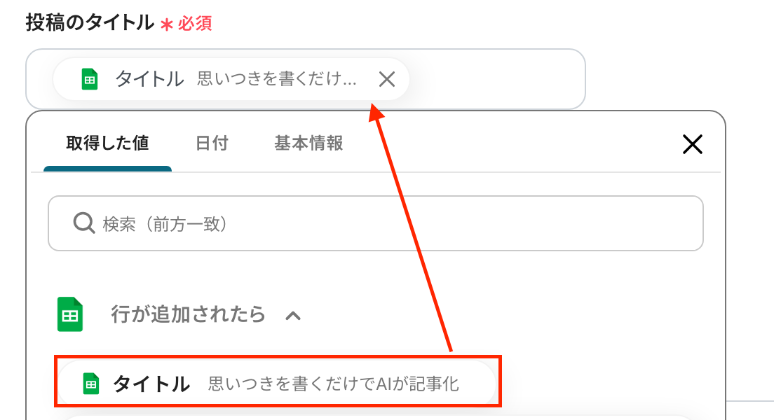 「投稿のタイトル」 :入力欄をクリックして表示されるアウトプットを引用して設定します。