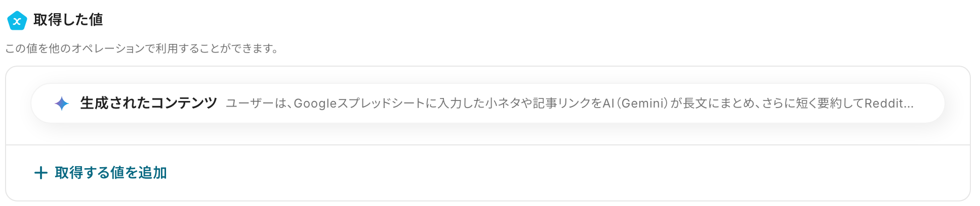Google スプレッドシートのトリガー設定では、対象のスプレッドシート、シート、そしてデータを取得するテーブルの範囲を任意で設定してください。 Geminiのアクションでは、テキストを生成するためのプロンプトを自由にカスタマイズできます。スプレッドシートから取得した情報を変数としてプロンプトに含めることも可能です。 Redditへの投稿アクションでは、投稿先のサブレディット、タイトル、本文などを任意で設定できます。固定値だけでなく、前段のフローで取得した情報を変数として利用できます。 ■注意事項