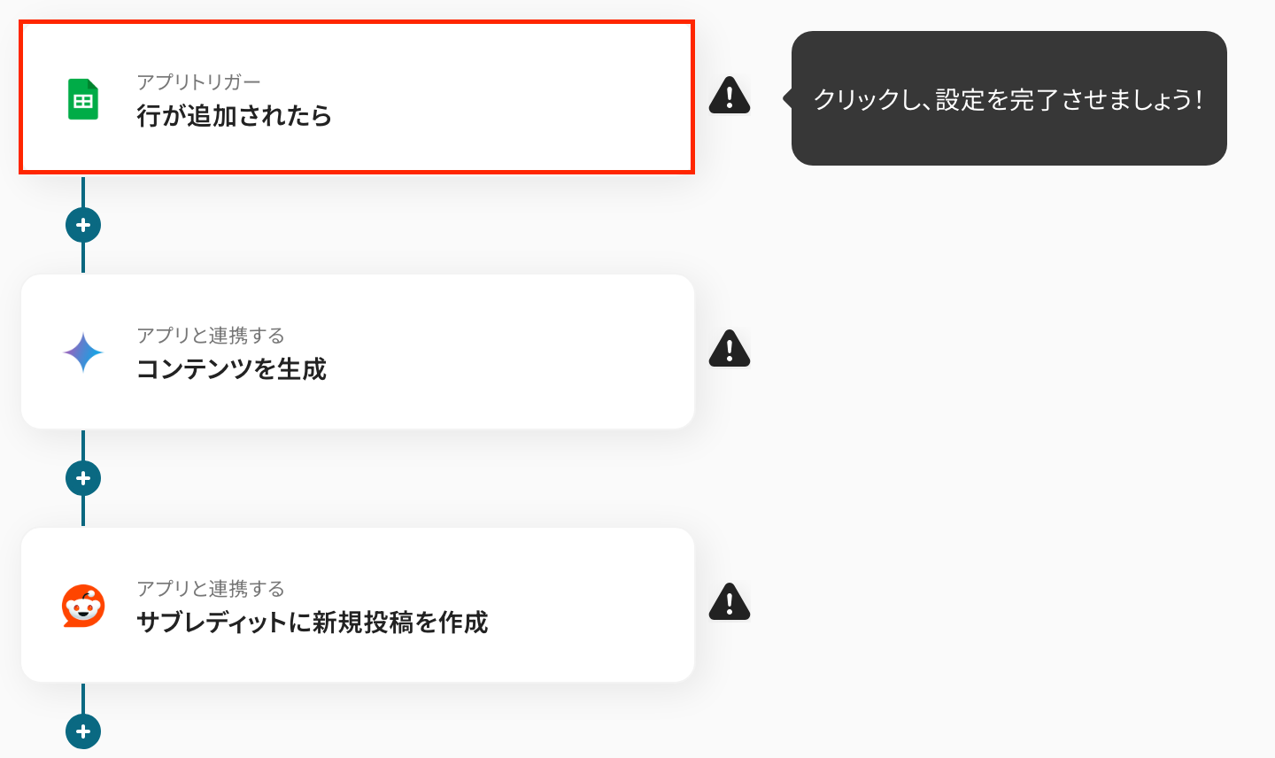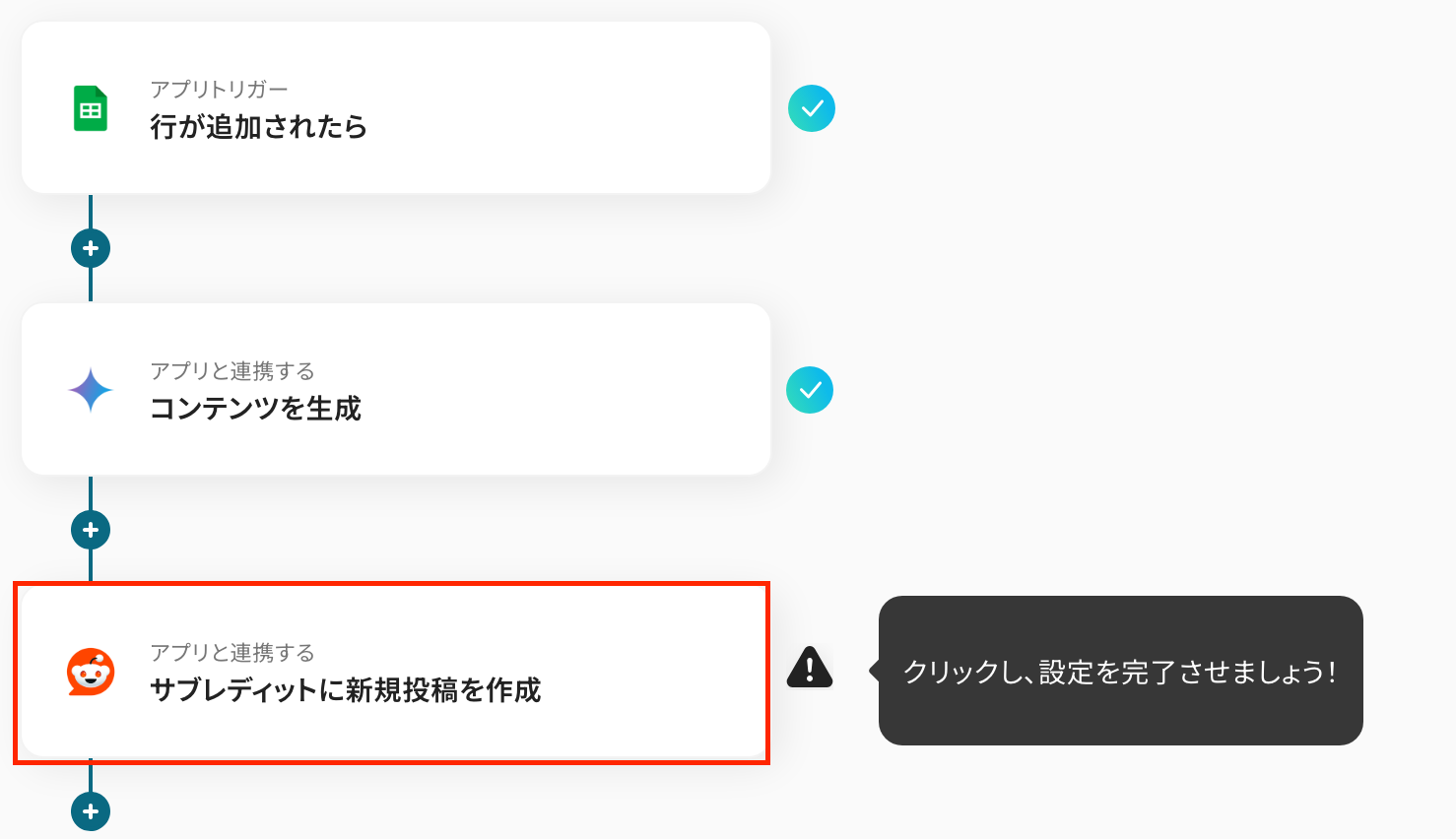 はじめに、Google スプレッドシート、Gemini、RedditをYoomと連携します。 次に、トリガーでGoogle スプレッドシートを選択し、「行が追加されたら」というアクションを設定します。 次に、オペレーションでGeminiを選択し、「コンテンツを生成」アクションを設定し、スプレッドシートの情報を元に投稿するテキストを作成します。 最後に、オペレーションでRedditの「サブレディットに新規投稿を作成」アクションを設定し、Geminiで生成したテキストを投稿します。 ※「トリガー」:フロー起動のきっかけとなるアクション、「オペレーション」:トリガー起動後、フロー内で処理を行うアクション
