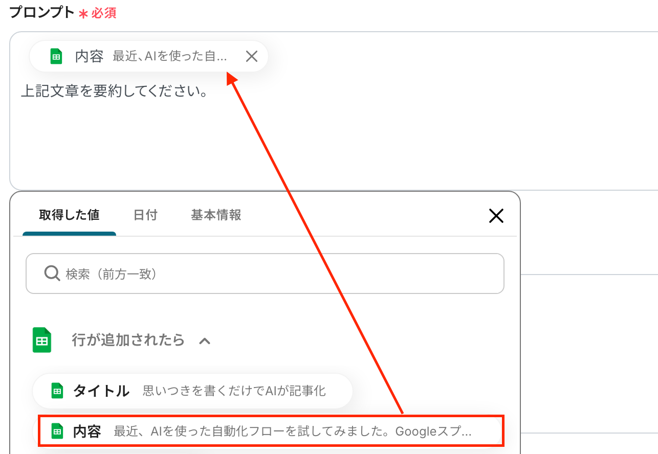 「プロンプト」 にはGeminiに指示する内容を設定します。 「上記内容を要約してください」という文言に加えて、前段階で取得した値を引用して設定してください。 これにより、フローボット起動の際に自動でチャットの投稿内容をプロンプトに引用できます。