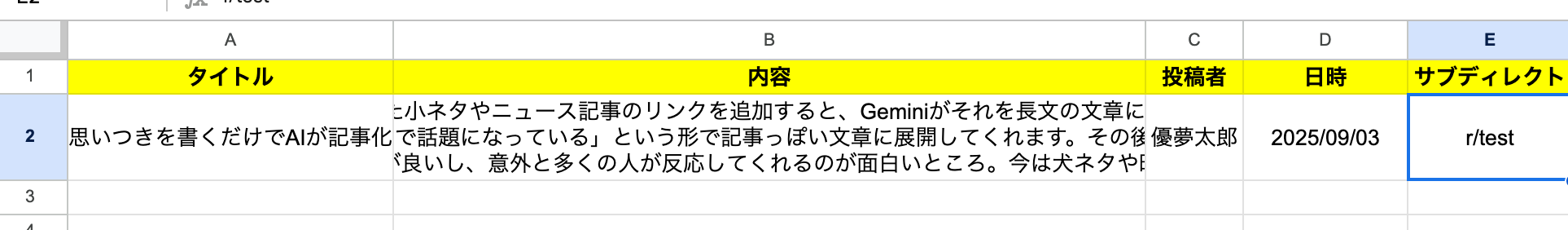 Google スプレッドシートに追加された行を元に、Geminiでテキストを生成しRedditのサブレディットに投稿する