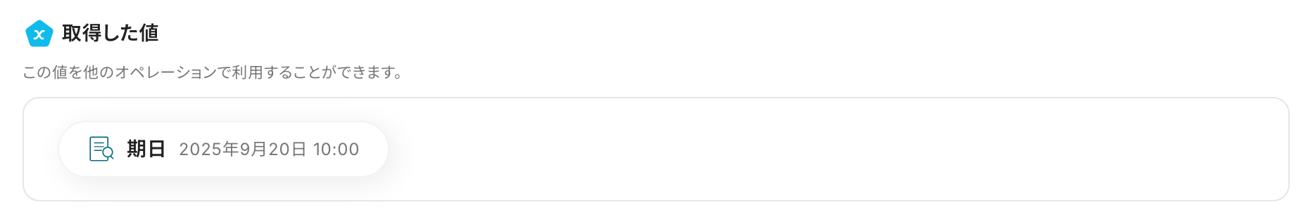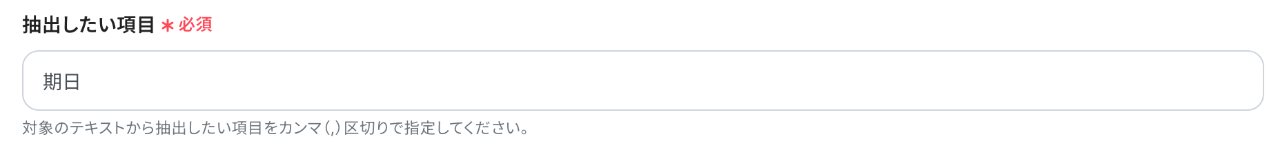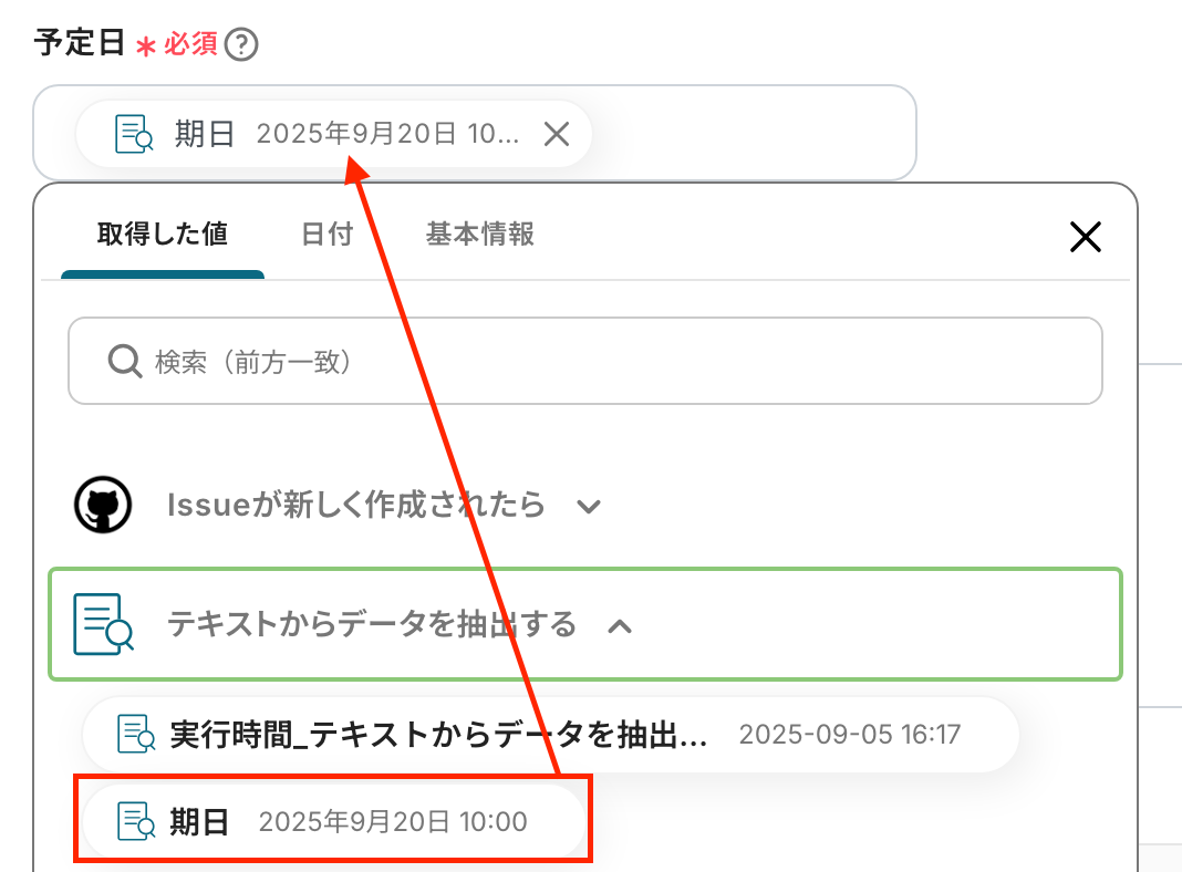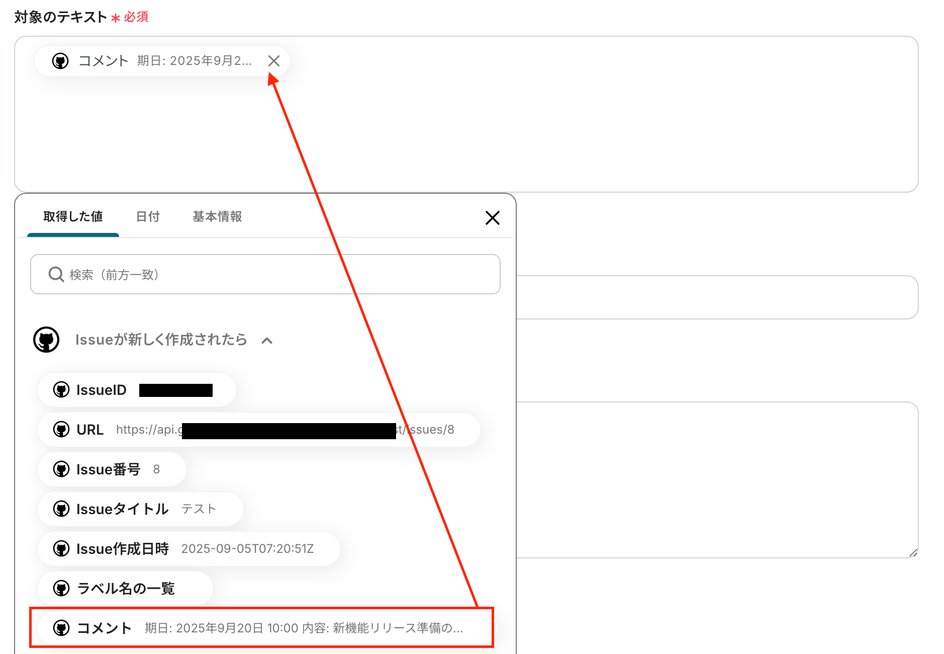 「対象のテキスト」:データを抽出したいテキストを設定します。入力欄をクリックすると前ステップで取得した値が表示されるので、引用して設定してください。この『取得した値』を活用することで、固定値ではなく、トリガーが実行されるたびに最新の情報が反映できます。