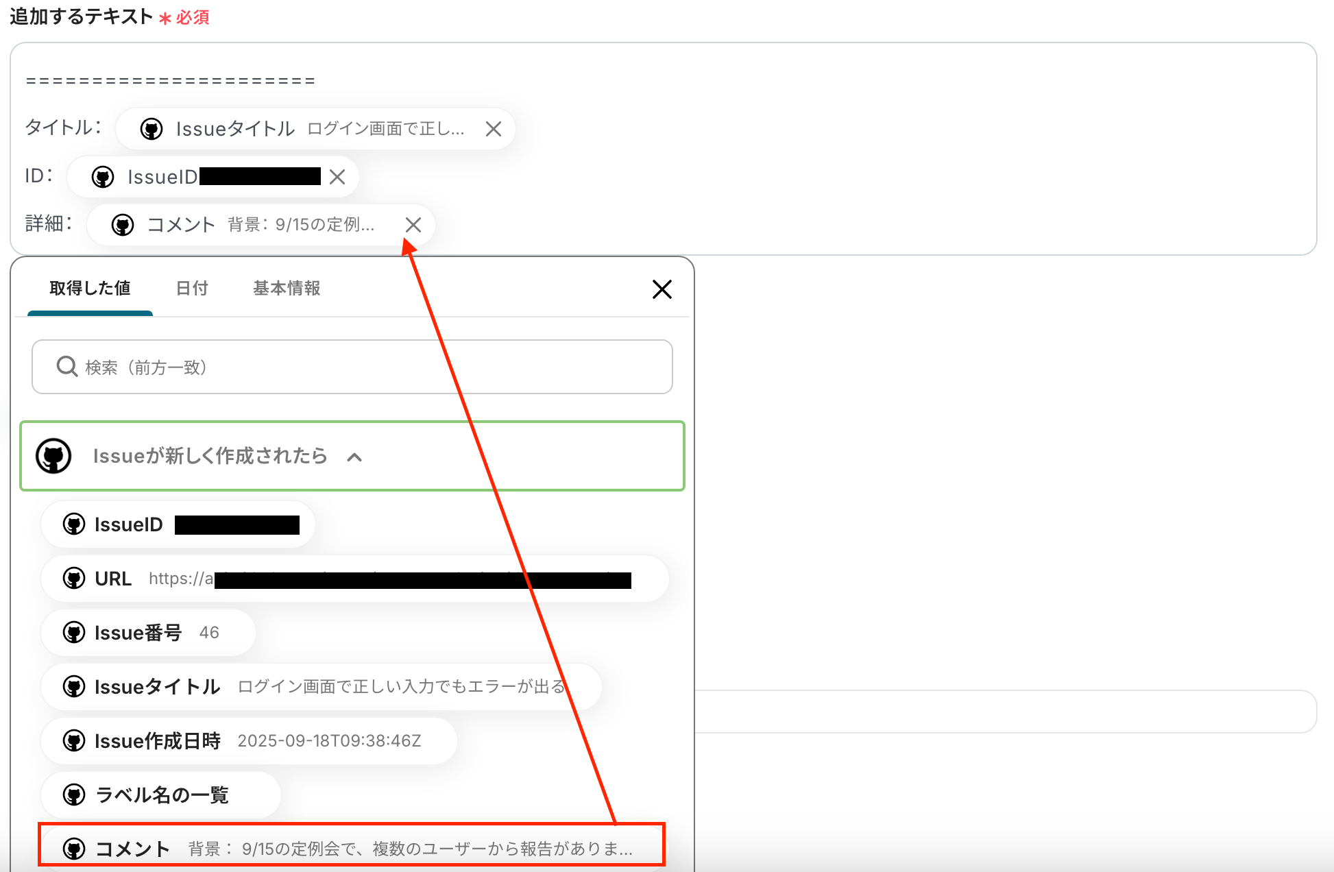 「追加するテキスト」:任意で作成した文章と前ステップで取得した情報を組み合わせて自由に入力してください。