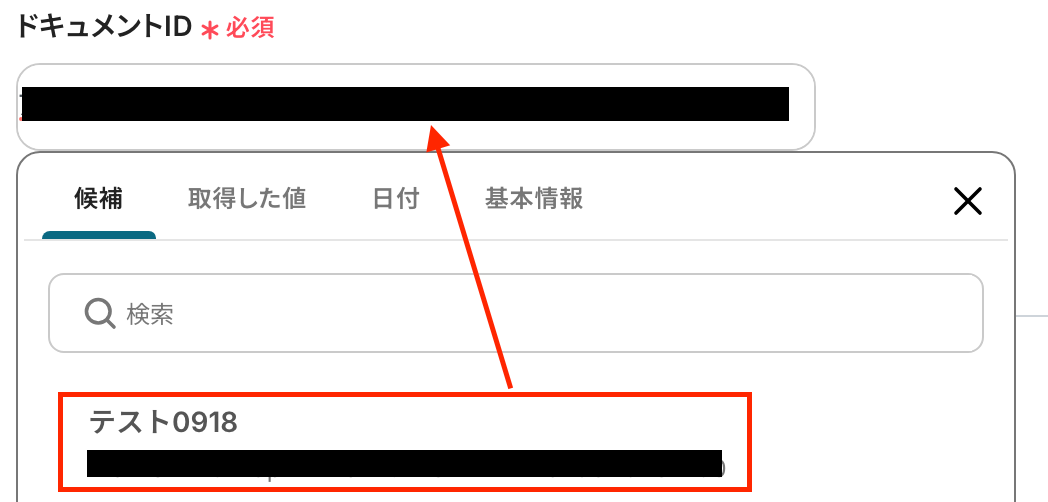 「ドキュメントID」:表示される候補から、テキストを追加したいGoogle ドキュメントを選択してください。