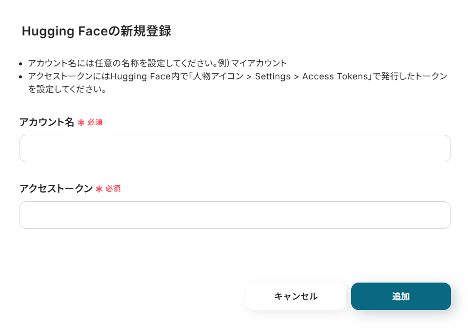 「アクセストークン」にはHugging Faceにログインして発行したトークンをペーストし、「追加」ボタンを押しましょう。