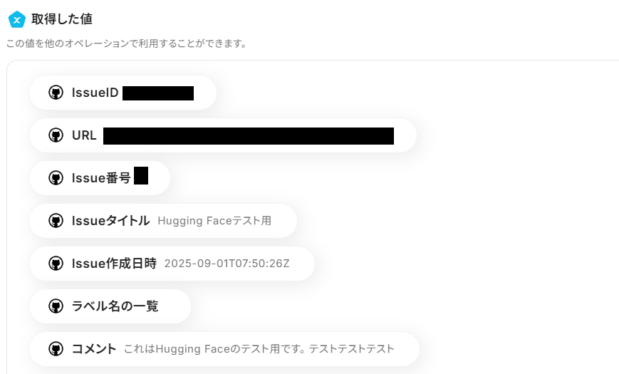 下にスクロールして、「取得した値」に作成したIssueの内容が反映されていれば成功です!