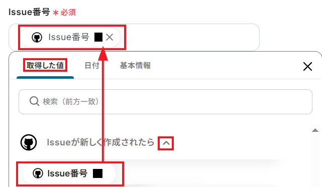 「Issue番号」には、アプリトリガーで作成したIssue番号を取得した値から入力しましょう。