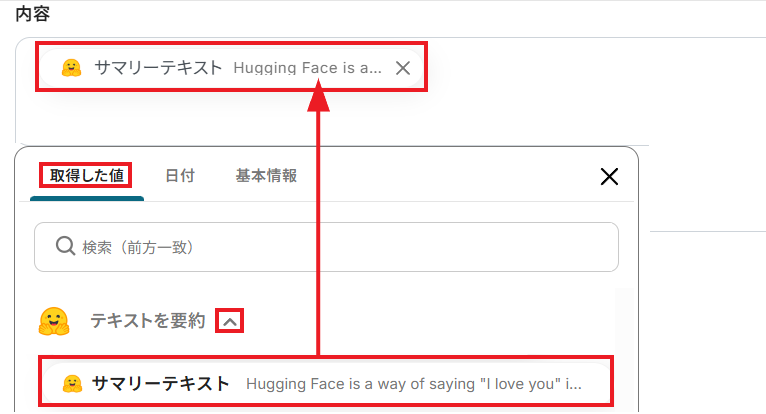 「内容」には先ほどHugging Faceで要約したテキストを、アウトプットから設定してください。