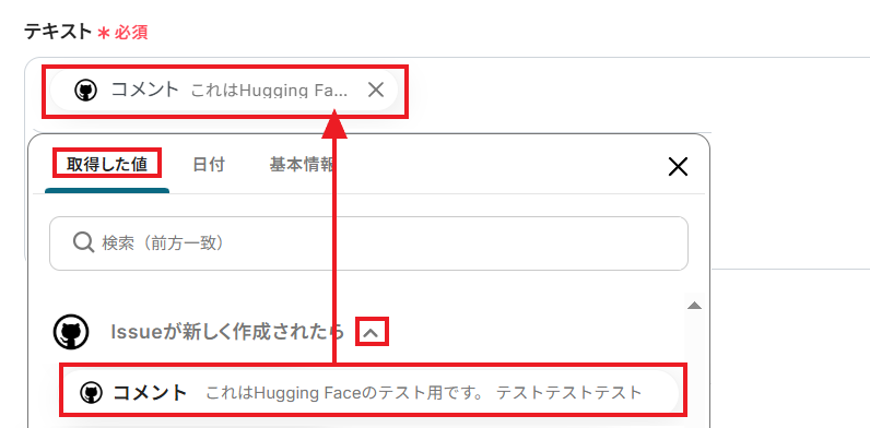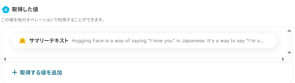 「テキスト」には、Hugging Faceで要約したい内容のテキストを設定しましょう。
