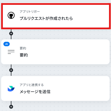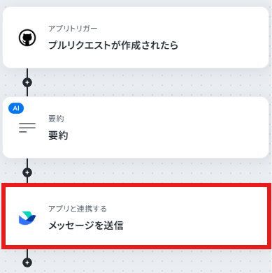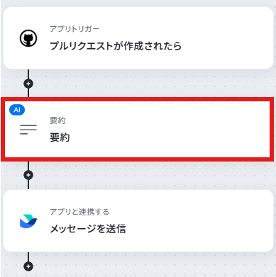 はじめに、GitHubとLarkをYoomと連携します 次に、トリガーでGitHubを選択し、「プルリクエストが作成されたら」というアクションを設定します その後、オペレーションでAI機能を選択し、トリガーで取得したプルリクエストの情報を基に、内容を要約するよう設定します 最後に、オペレーションでLarkの「メッセージを送信」アクションを設定し、AIによって要約された内容を指定のチャットに通知します ※「トリガー」:フロー起動のきっかけとなるアクション、「オペレーション」:トリガー起動後、フロー内で処理を行うアクション■このワークフローのカスタムポイント
