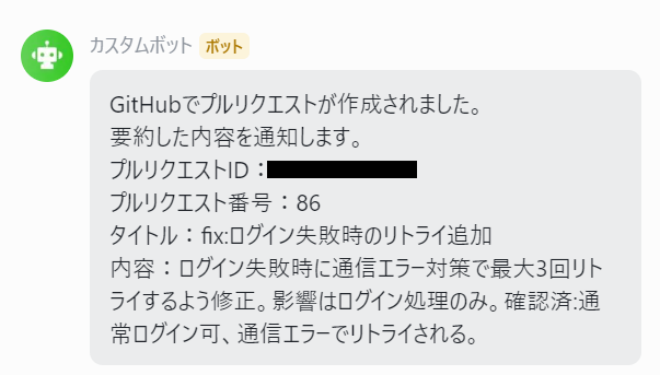 プルリクエスト作成から内容の要約、そしてチームへの通知までの一連の流れを自動化し、これまで手作業で行っていた情報共有の時間を短縮します。 Hugging Faceによる自動要約を利用することで、プルリクエストの主要な変更点を迅速に把握でき、手動での確認作業に伴う見落としなどのリスクを軽減します。 ■フローボットの流れ